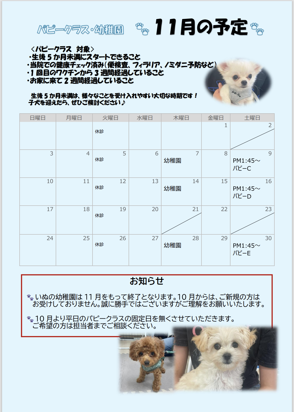 11月のパピークラス・幼稚園のお知らせを掲載します。
