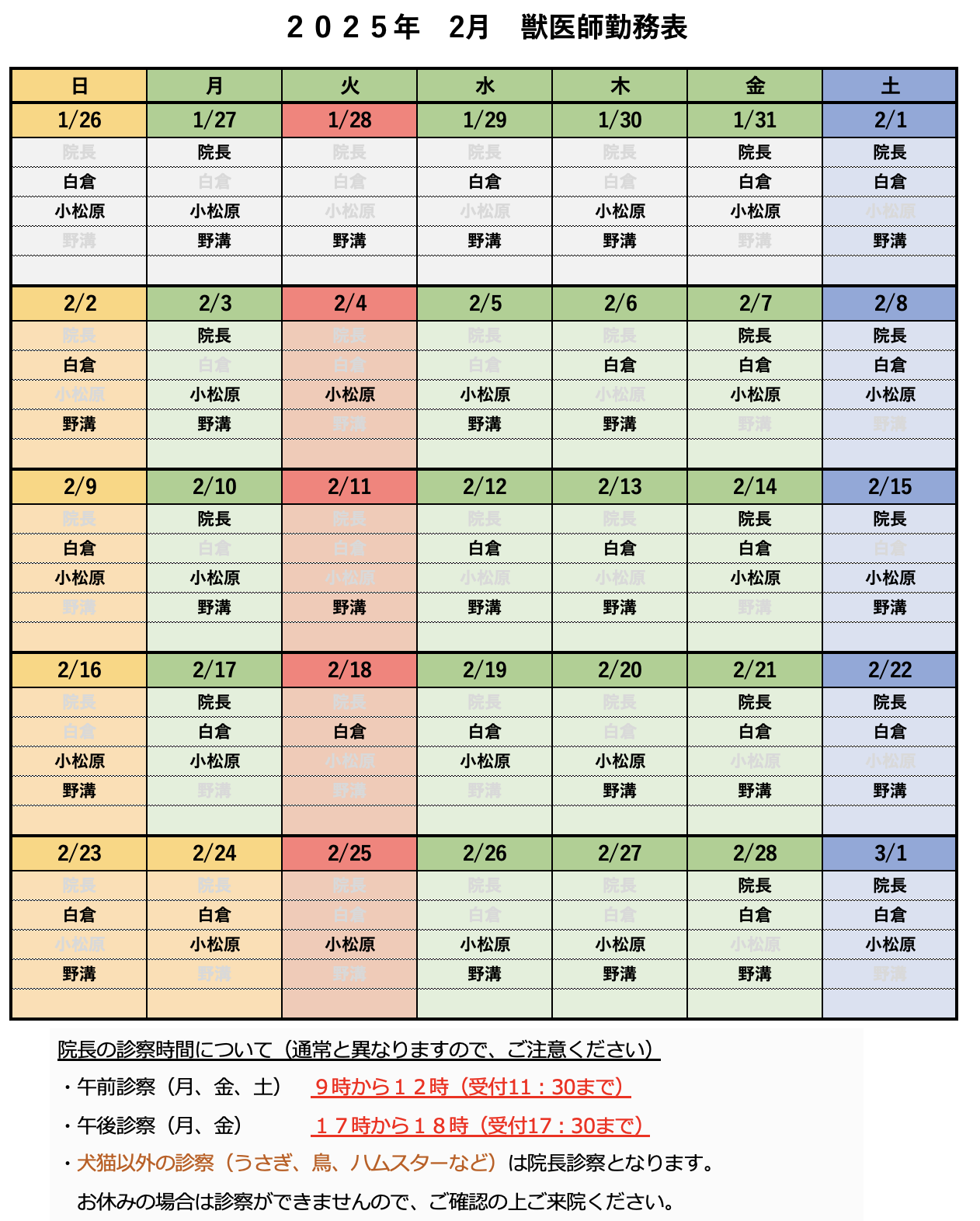 【2025年2月】獣医師勤務表