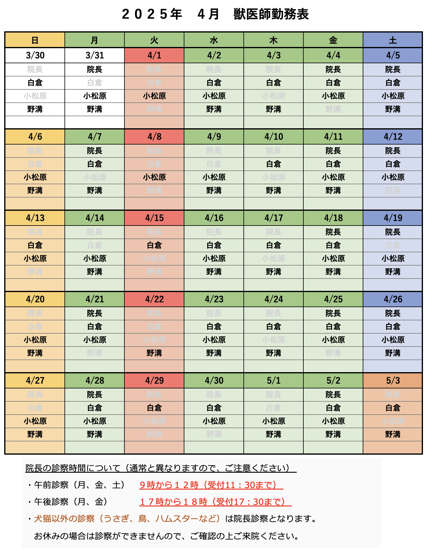 【2025年4月】獣医師勤務表