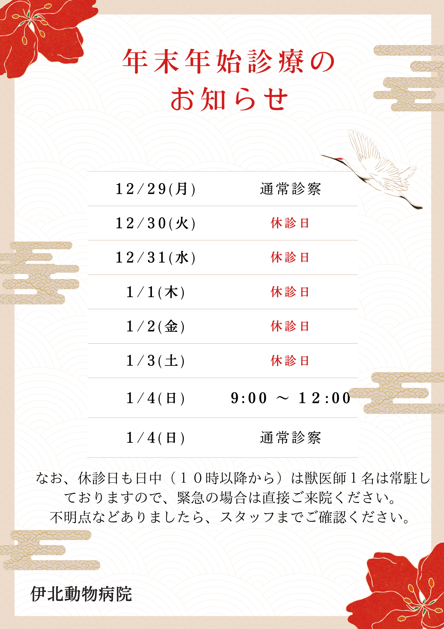年末年始の休診日のお知らせです🎍 12月30日(火)から1月3日(土)まで休診とさせていただきます。 新年は1月4日(日)午前診療、5日から通常診察となります🏥.